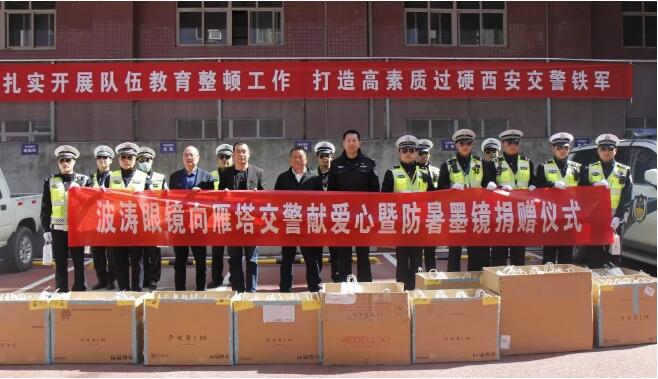 没有人民警察,就没有人民的安居,更没有我们企业稳定发展的大环境!为了我们的稳定、安居和安心经营,干警们日夜为我们守护着。即将进入夏季,骄阳炎炎,人民警察守候在无数个高速路口、车站、机场,十字路口.......为了向确保我们社会平安稳定和做出奉献的干警们表达自己最崇高的敬意,在六月六日“爱眼日”即将到来之际,陕西波涛眼镜董事长项岳强向雁塔交警大队共捐赠660付太阳镜,表达尊爱之心。
